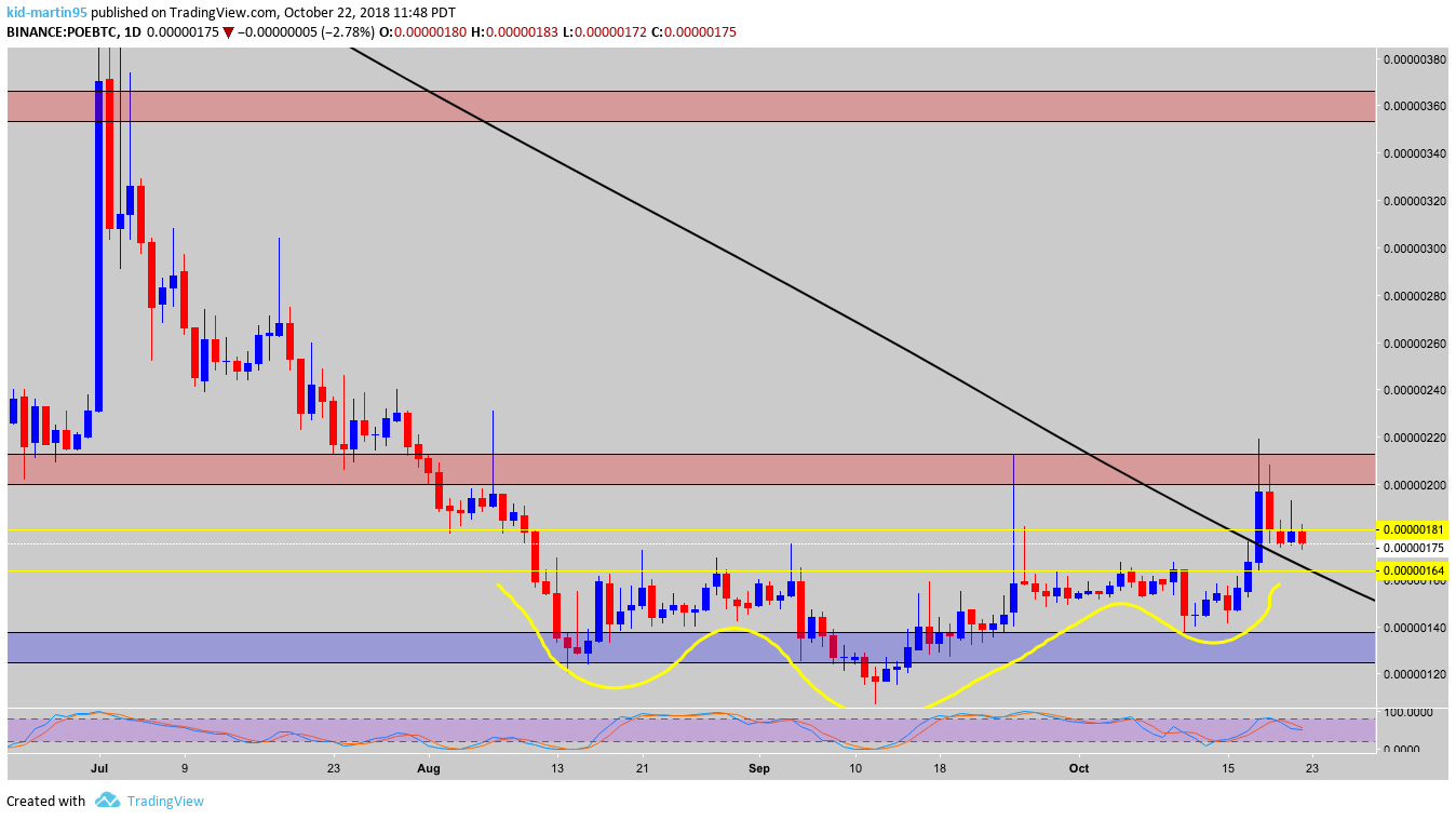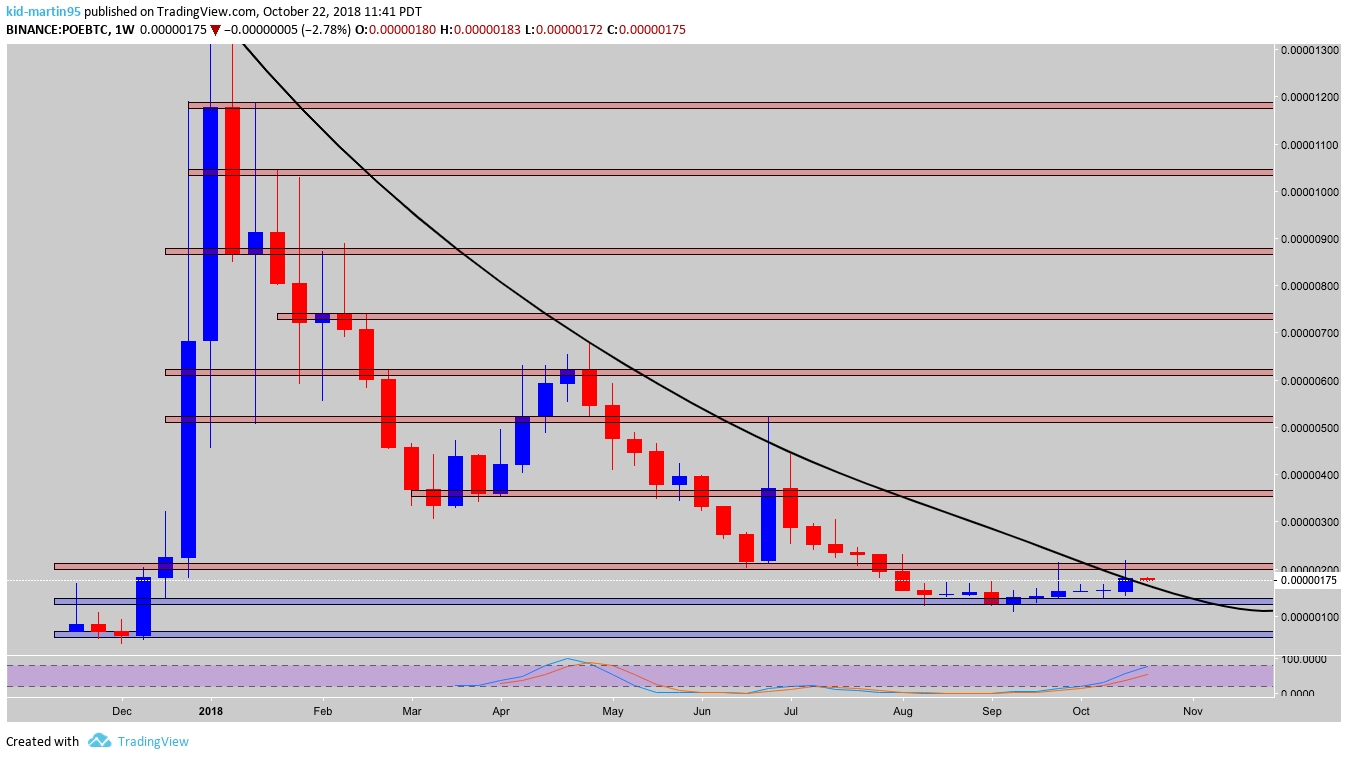 Looking at our trend timeframe we see price continuing to respect our down trend, currently testing our resistance at 200 satoshis. Support has been found at 100, will watch smaller timeframe for entry. Last time POE was at this level was back in December of 2017.