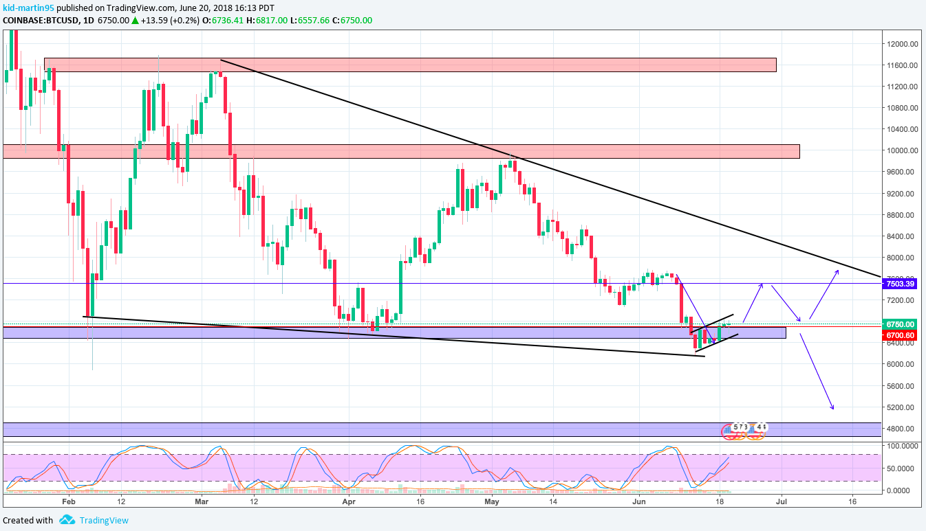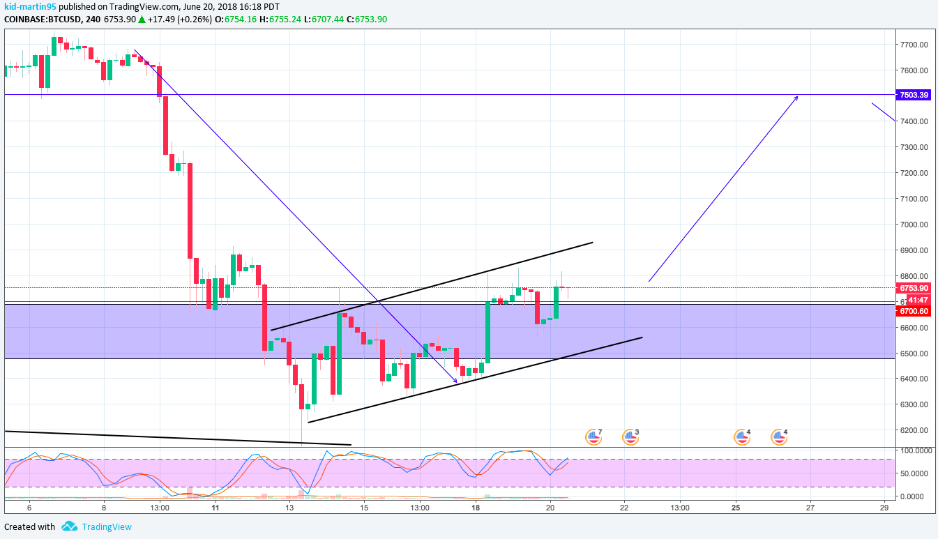 Shifting over to our pattern timeframe we see price respecting channel structure. Momentum forming higher lows, a close above $6,800 should push BTC towards $7,500. If we fail to close above $6,800 expect a drop towards $5,000.