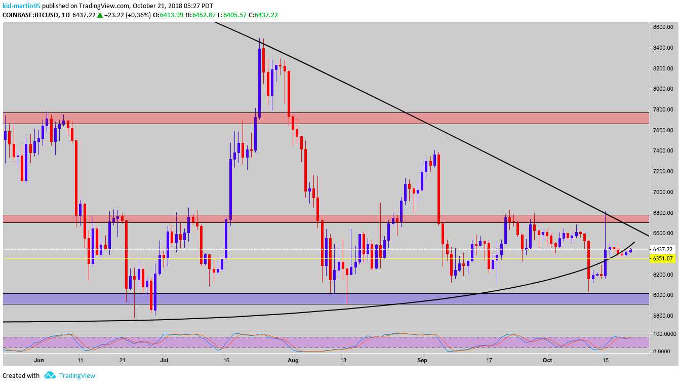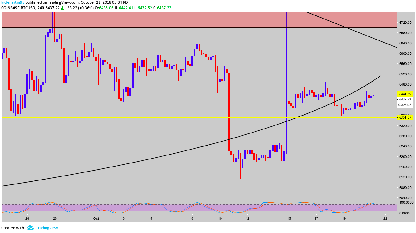 Shifting over to our pattern timeframe we see 4hour resistance at $6,440, stochastic rsi showing momentum in favor of bulls however we have peaked and should be expecting a correction. Expecting Bitcoin to retrace towards $6,410 leaving a higher low imprint, if we do not hold at this level expect a sell off towards $6,200. A 4hour close above $6,440 and expect another extension towards $6,700.