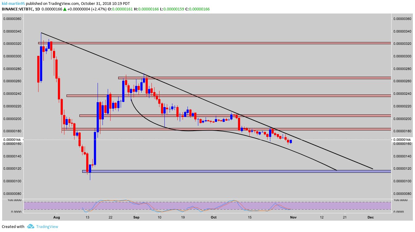 Looking at our trend timeframe we see price continuing to respect our downtrend, stochastic rsi showing momentum is in favor pf bears with no signs of reversal. Last time price was here was back in August. No major support levels shown until 120 satoshis. Looking for a daily close above 170 satoshis or a bounce off 120, potential psychological support at 150.