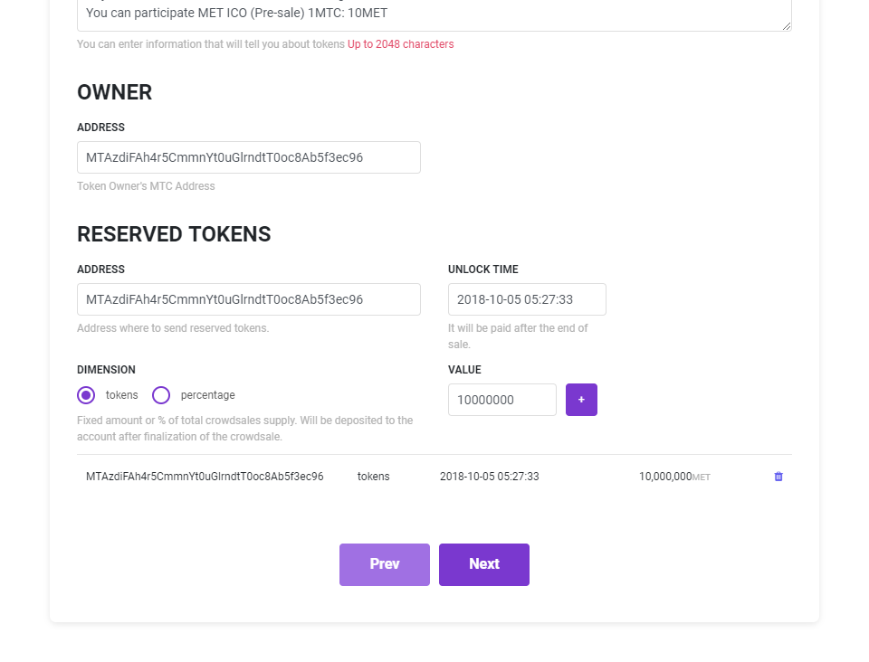 RATE: ICO exchange rate. Enter how many tokens to provide per MTC.