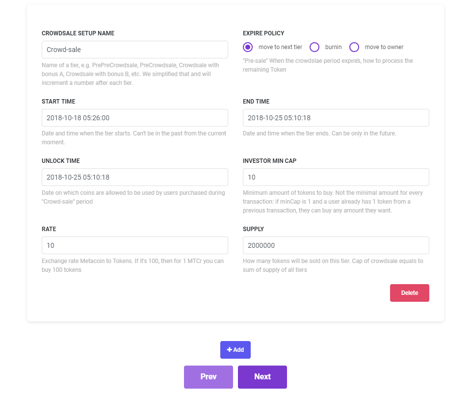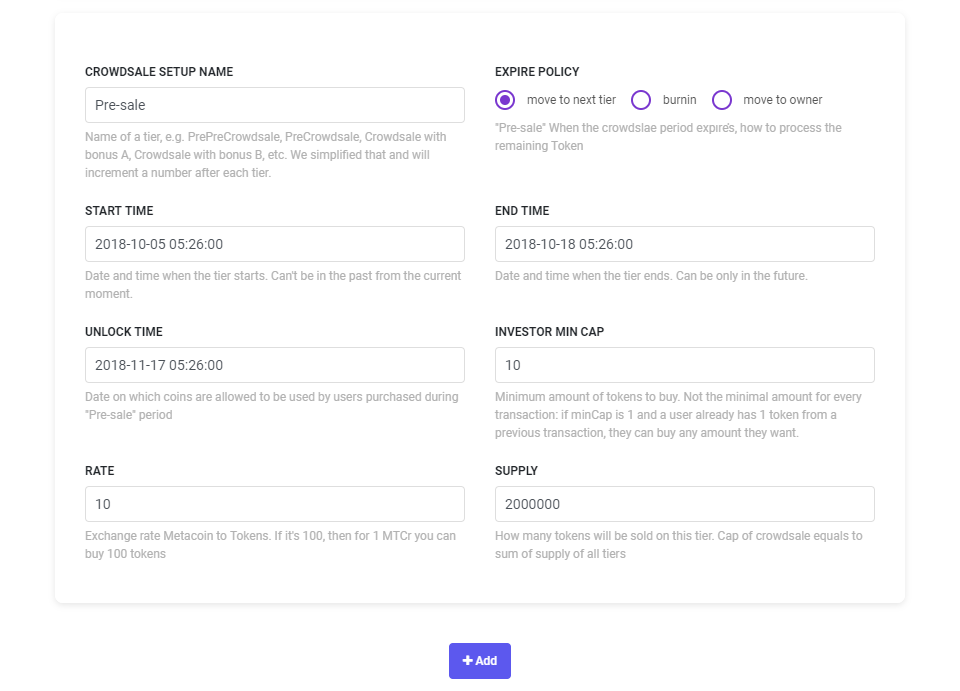 [+ADD]버튼을 클릭하면 여러 단계의 ICO를 설정할 수 있습니다.
