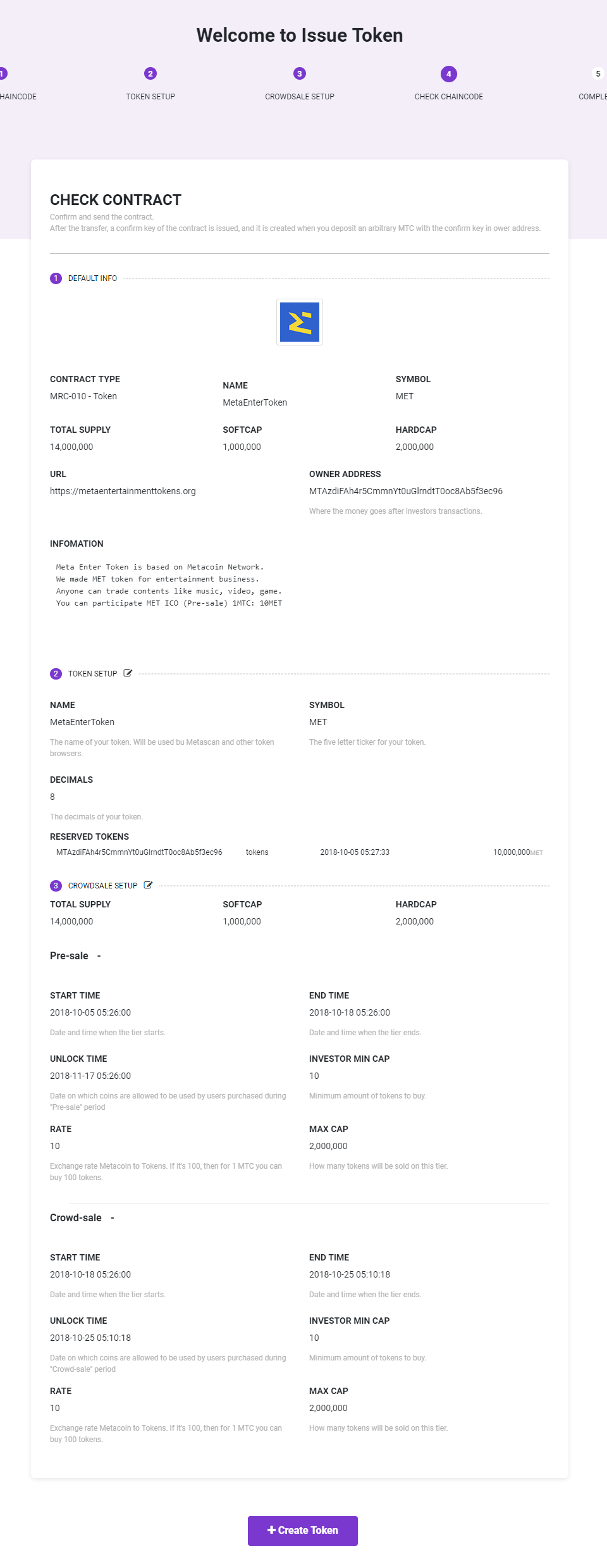 The IssueToken is only avaiable for Testnet on now(2018/10/05), but it’s scheduled to get actual Meta Token ICOs for 2018/4Q.
