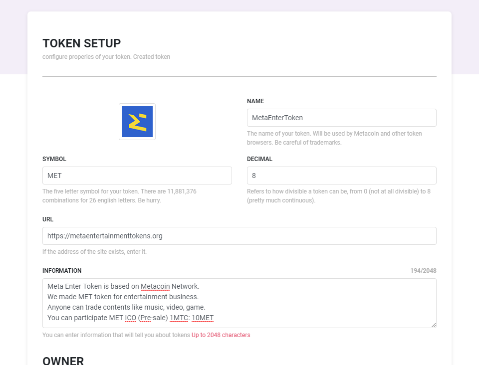 SYMBOL: Enter the symbol(code,Abbreviation) of token. ( Ex. BTC, ETH, MTC )