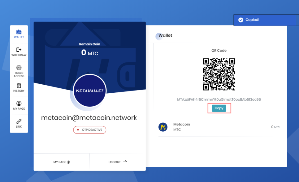 Please keep the wallet address with clicking “COPY” button.