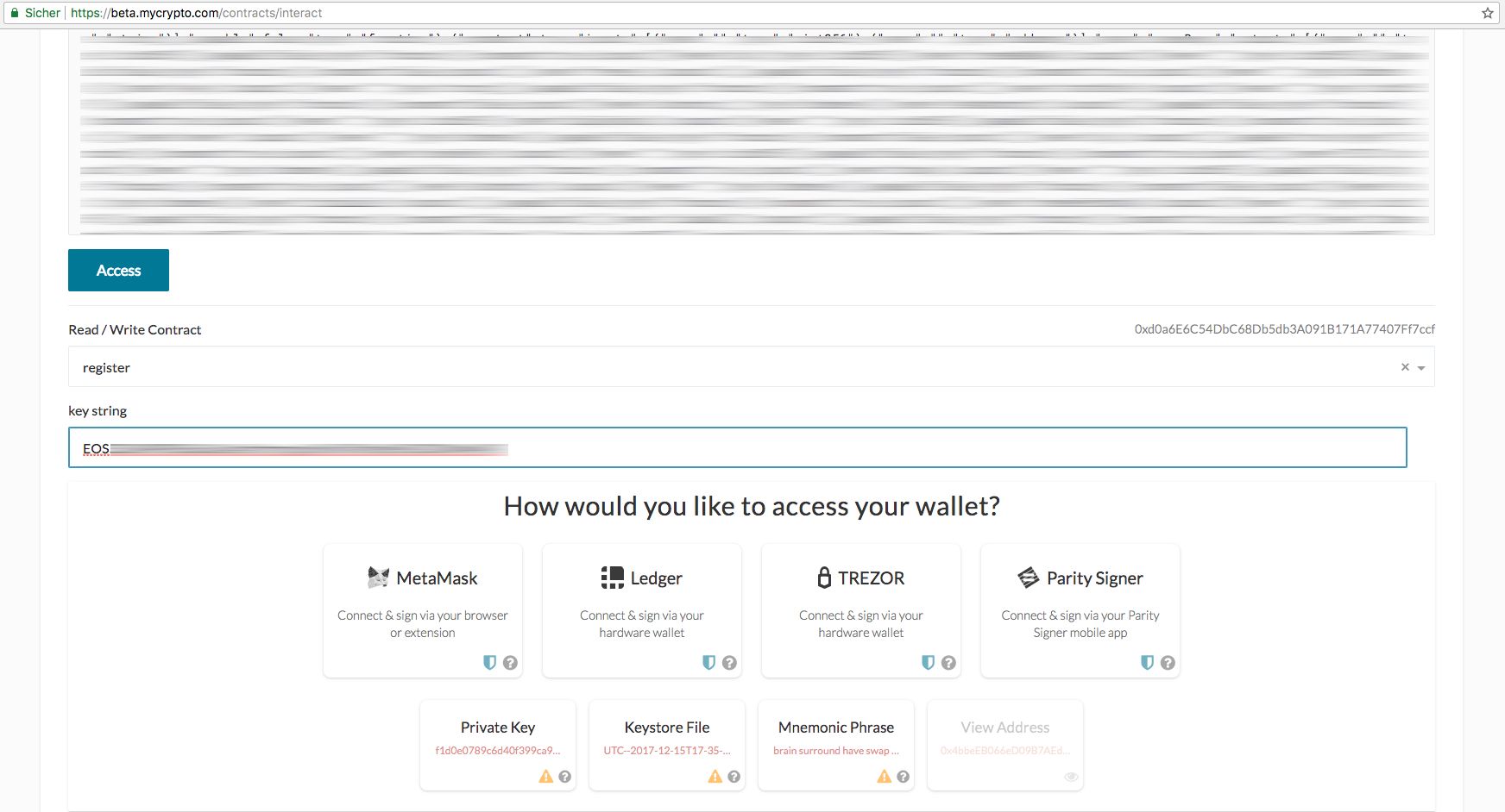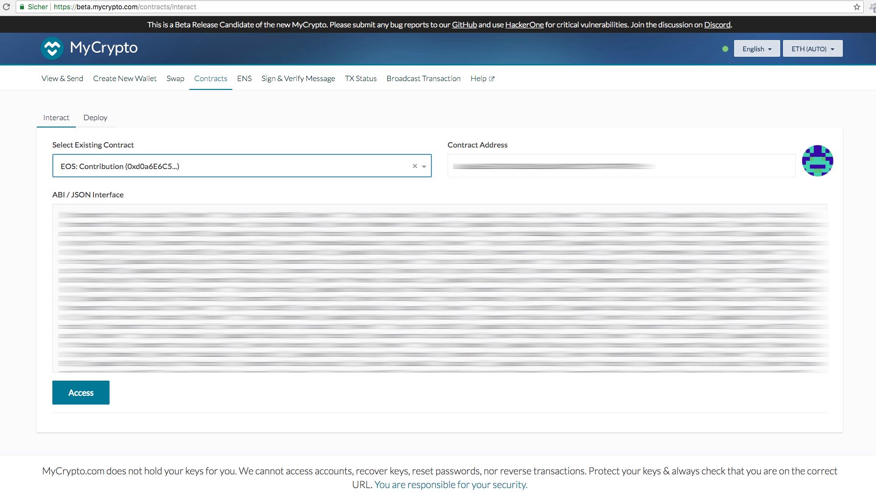 Als nächstes den öffentlichen Schlüssel kopieren und zu MyCrypto https://beta.mycrypto.com/contracts/interact gehen
