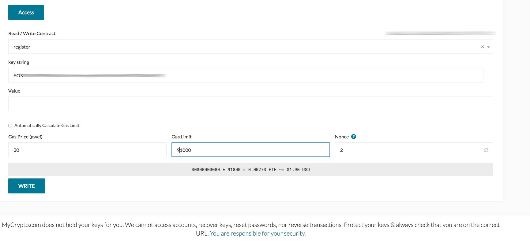 Im Feld "key string" den öffentlichen EOS-Schlüssel eingeben (Vorsicht! Niemals den privaten Schlüssel!)