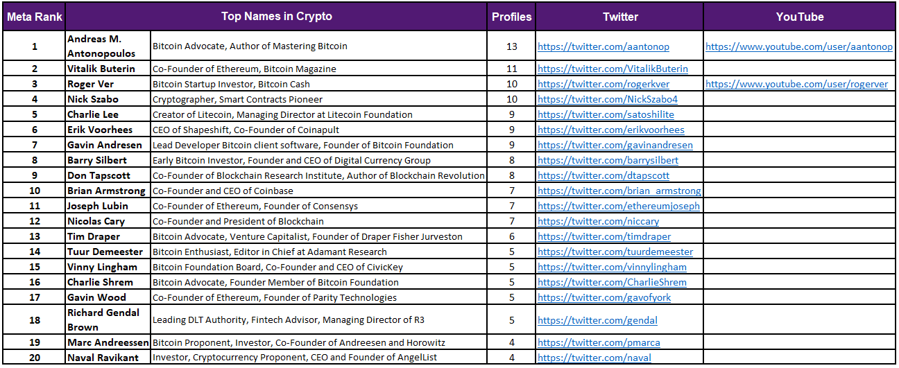 The current top 20 Top Names by Meta-Rank as of June 1, 2018 are posted here. With more than 400 Top Names in Crypto, our full list with Meta-Ranks is also available for free download using the link at the bottom.