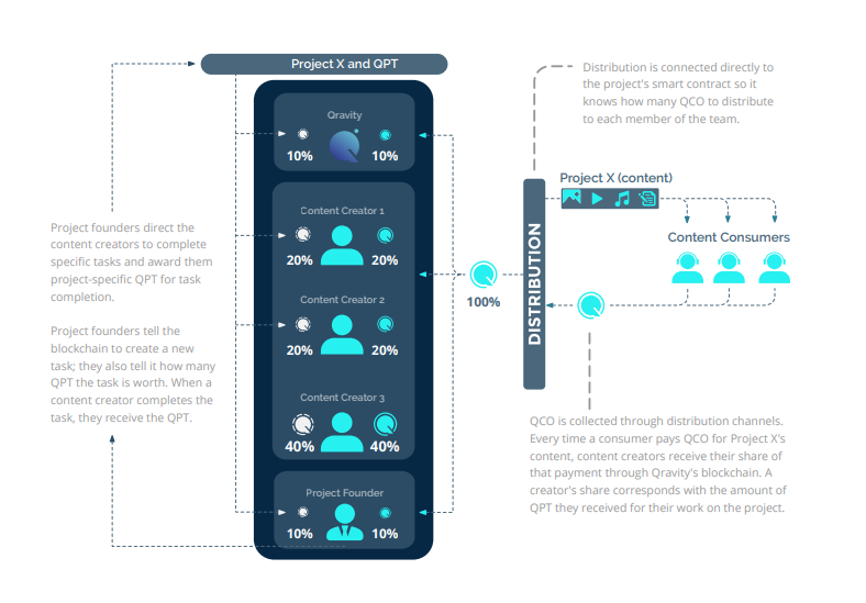 QPT tokens are given to content creators in exchange for work they complete for a project. A Content creator can complete tasks in exchange for QPT. Every time a consumer or distributor buys content on Qravity, creators receive a portion of the payment in QCO based on the amount of QPT they earned for their contribution to a particular project.