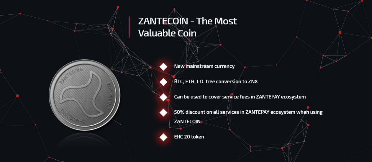 By the end of 2018, the ZANTE PAY prepaid card will be launched, which should become one of the most penetrating digital currency cards in the market. It will allow any holder of BTC, LTC, ETH, ZNX cryptographic currency to spend its coins, online or offline, where traditional payment cards are accepted. ZANTE PAY will act as an intermediary linking the card issuer, the ZANTE PAY portfolio, the compliance services and the cryptographic exchange. ZANTE PAY allows users to have a single point of access to the complex financial and technical infrastructure in an easy to use way.