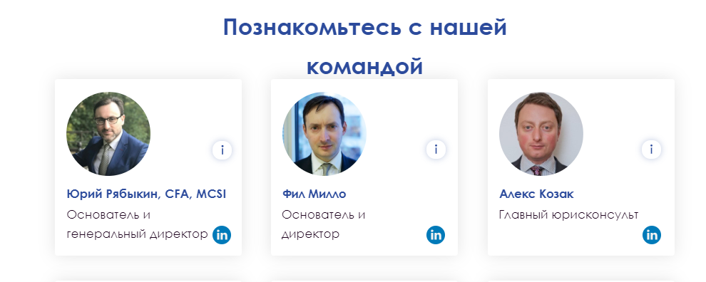 Г-н Рябыкин имеет степень магистра технических наук в Курской государственной сельскохозяйственной академии и степень бакалавра финансов в финансовом университете Российской Федерации. Он является владельцем Хартии CFA, а также членом дипломированного института ценных бумаг и инвестиций. - Фил Милло имеет большой опыт работы в сфере технологий и финансовых отраслей.