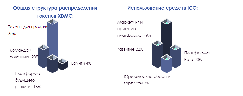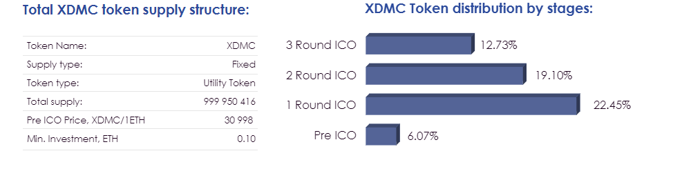 XDMC за 1 ETH = 30 998. (Токены, выделенные команде, подлежат трехлетнему периоду перехода. Каждые шесть месяцев будет выделено около 17% токенов. В случае ухода члена команды не будут выделены токены, а те жетоны будут зарезервированы для новых участников).