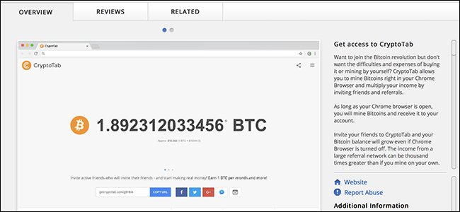 Google today announced they are removing extensions that mine currency without user permission, which is great. But scammy extensions like CryptoTab, shown above, remain in the store. It’s hard enough to make a profit mining Bitcoin using a gaming PC, because of electricity costs. It’s hard to imagine a browser-based extension, which doesn’t have access to your GPU, even coming close to that. Basically there’s no good reason for this extension to exist, and on top of everything there’s a pyramid-type referral scheme.