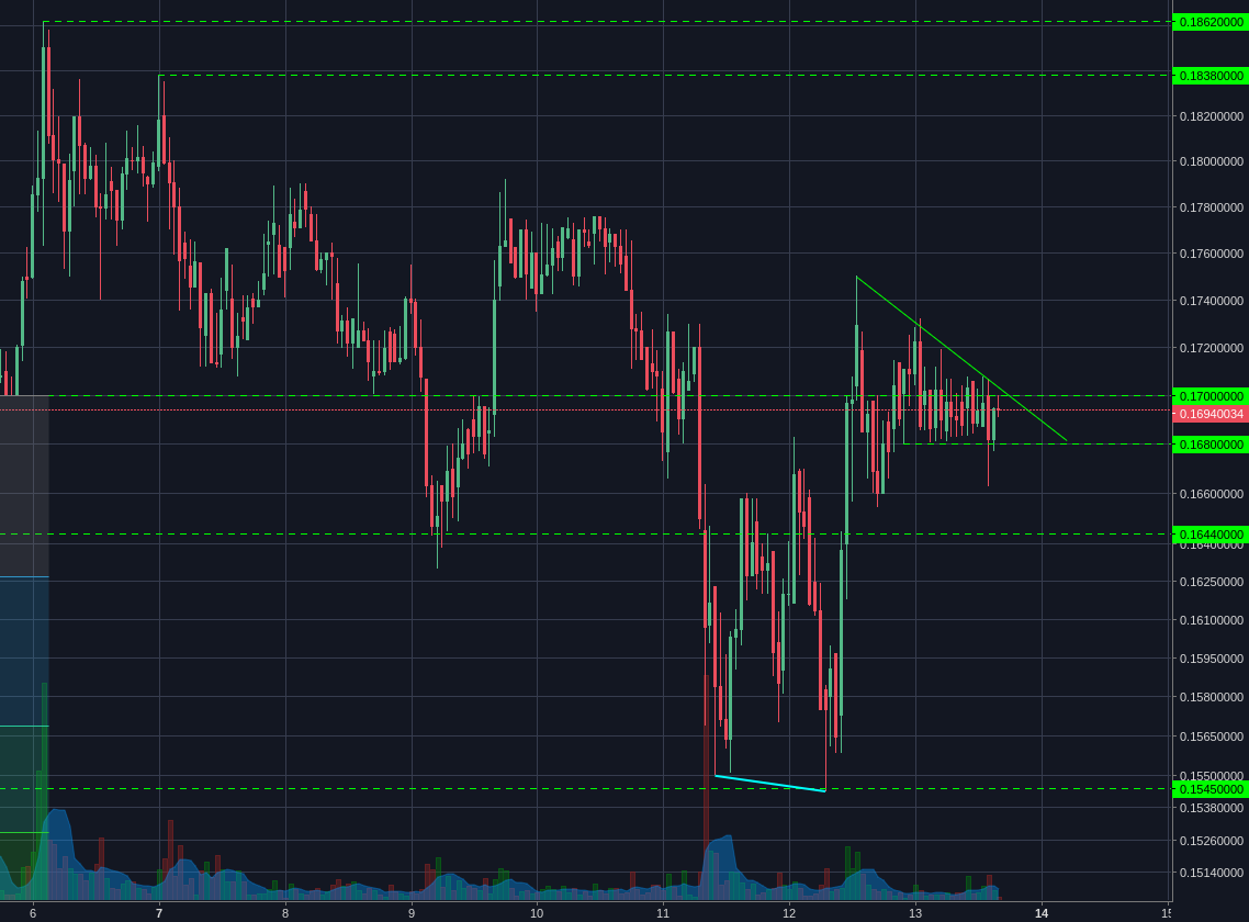 The second interpretation has the double test of the 0.1545 support as a double bottom, which then pushed up into a weird pennant/ general bullish consolidation.
