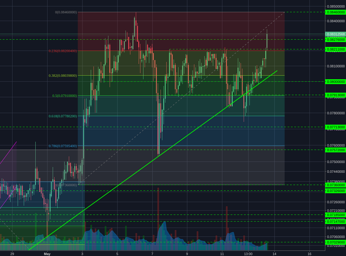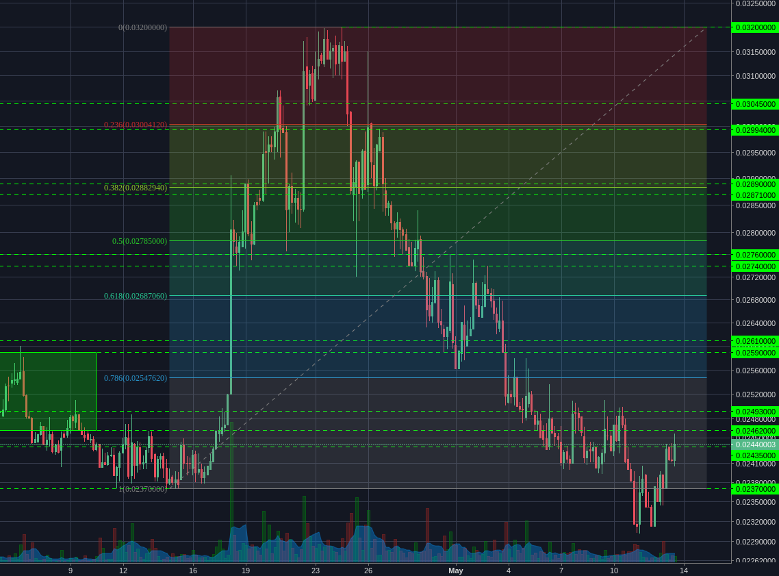 Ethereum managed to bounce back above its support line and is now making a retest towards the 0.08460 resistance. Volume is a bit low for my liking, considering the speed of the climb. I recommend wait for a secondary consolidation around highs before buying into this move, otherwise it carries quite a lot of downside risk.