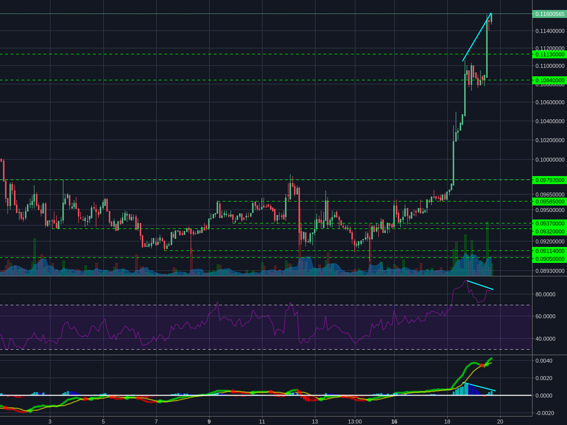 BCHBTC made a brief pullback around the 0.1084 support/ resistance before continuing its climb. While volume remains high, we're starting to see some bearish divergence on this leg of the pump, signalling weakness to the trend. While this isn't necessarily an indicator of the local top, it certainly isn't a strong sign for the bulls, and we'll be looking for a good consolidation after this leg has completed.