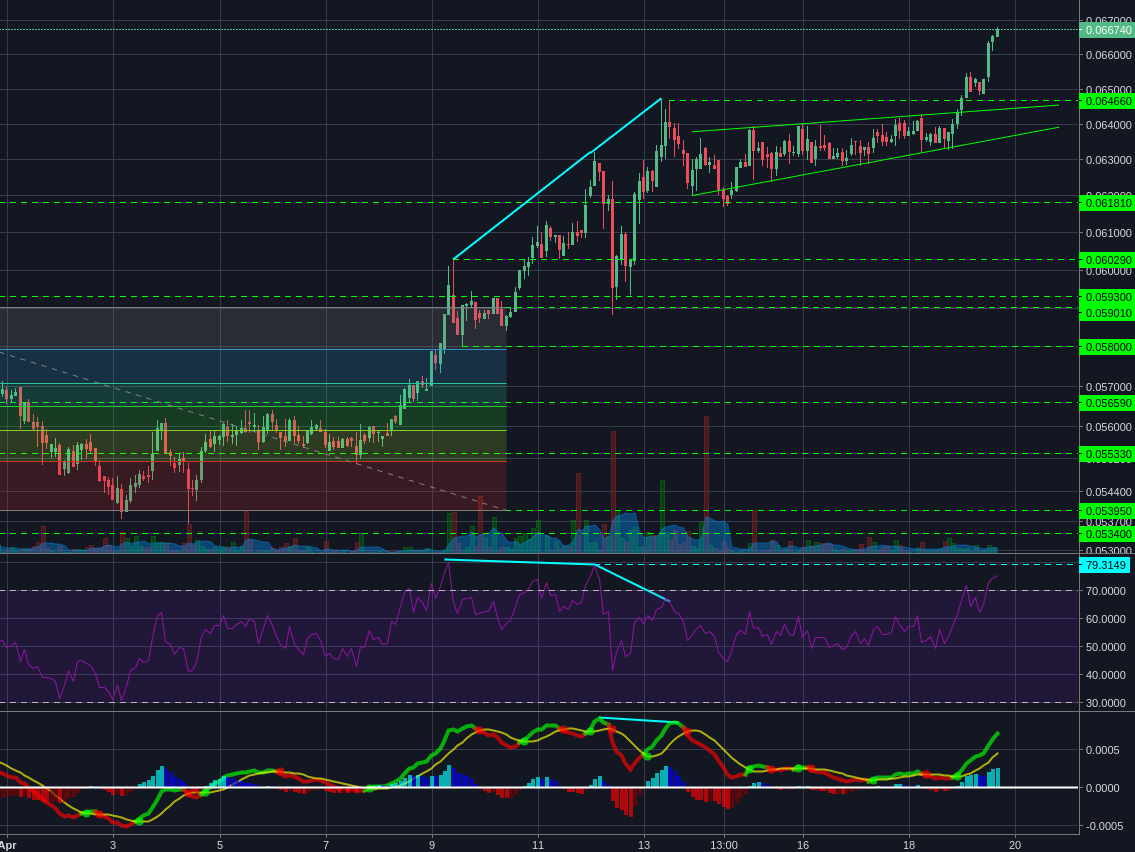 After bouncing from the ascending support, ETHBTC made a good break of the 0.06466 resistance to make new highs. However, the lack of volume is concerning as we push higher, indicating a lack of interest in this bullish trend. This gives a significant risk of a sharp retracement once we find a strong resistance, so starting to take profit is a good idea if you're not able to actively manage the position.