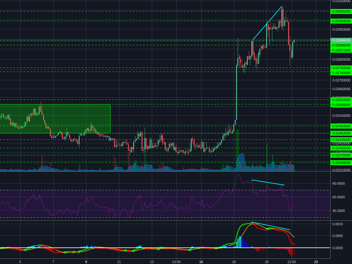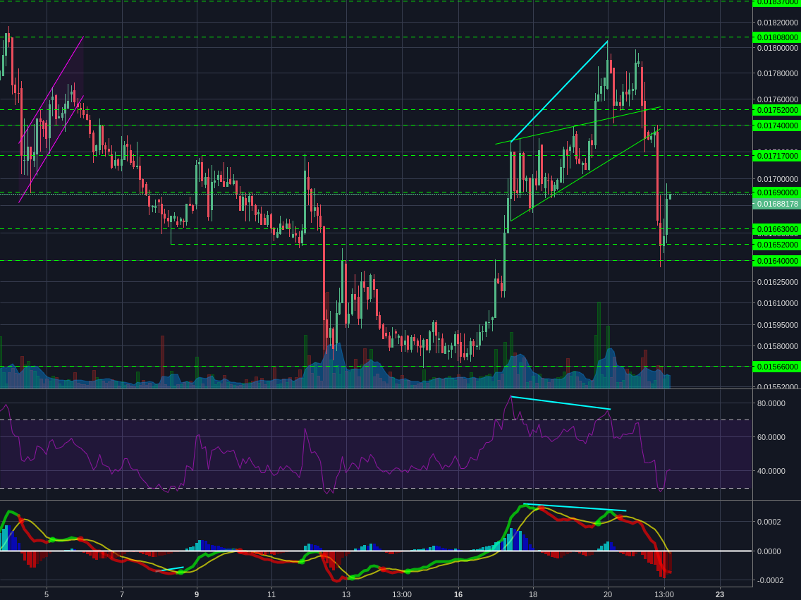 This may form a large descending wedge/ flag, which would be a bullish sign, but that remains to be seen on the retest below 0.06775. I recommend holding off on building up positions until a good support level has been confirmed.