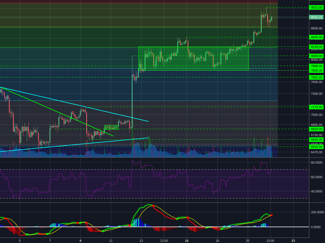 After forming a good consolidation above the 61.8% support of the macro extension, Bitcoin pushed up yet again, reaching as high as $9023 before pulling back a little to the 38.2% support. This climb came on decent volume and continued new highs on both the RSI and MACD.