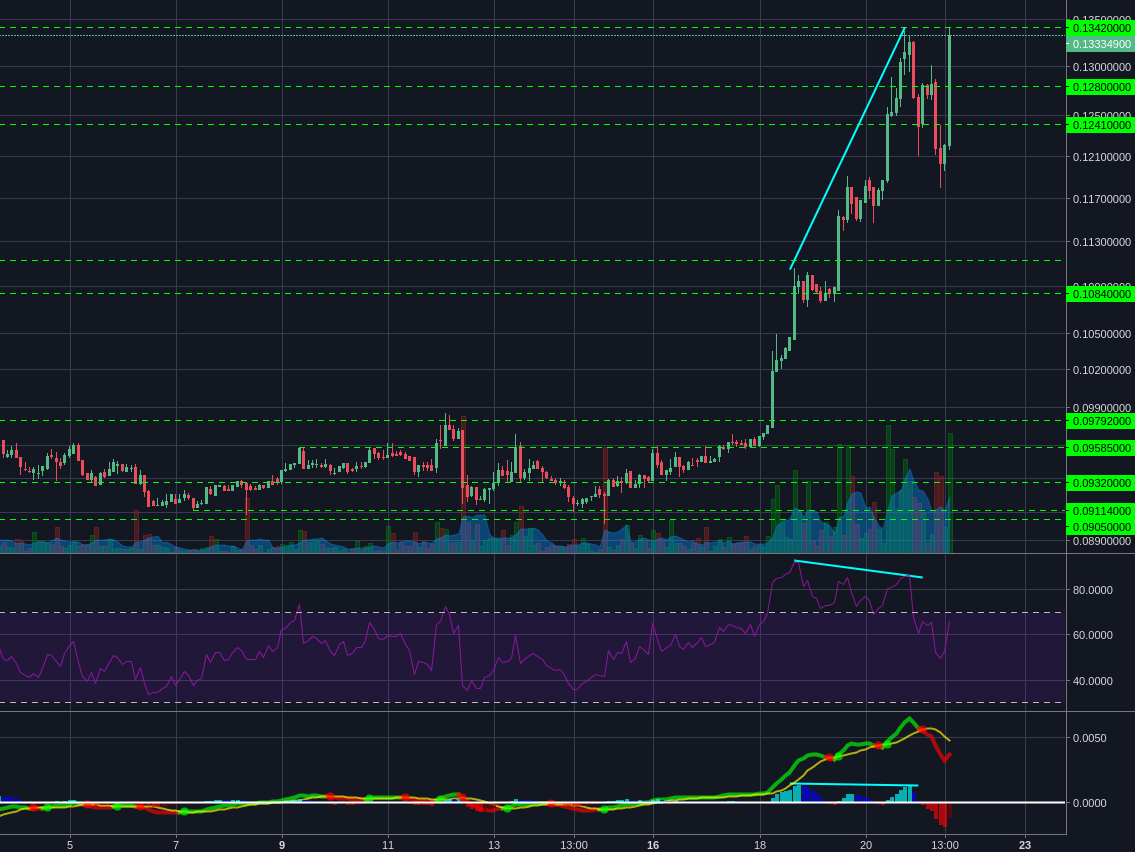 Bitcoin Cash also saw bearish divergence before a swift pullback from highs, however BCHBTC has moved to retest the 0.1342 resistance extremely quickly and with a good volume spike. Volume has been increasing throughout the length of the recent climb, showing a lot of strength to the bullish leg.