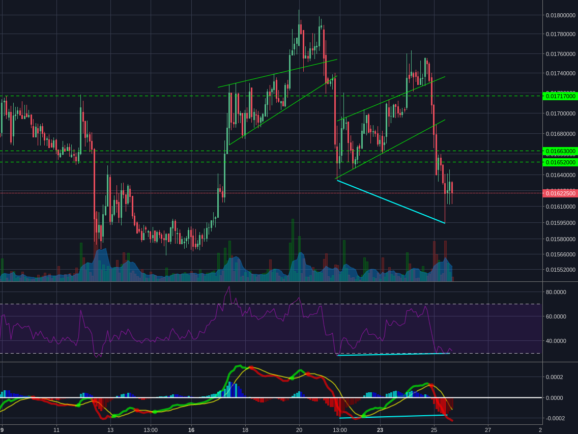 Litecoin managed to briefly push above its ascending channel/ wedge before breaking down once more (similarly to the previous wedge), reaching as low as 0.01594.