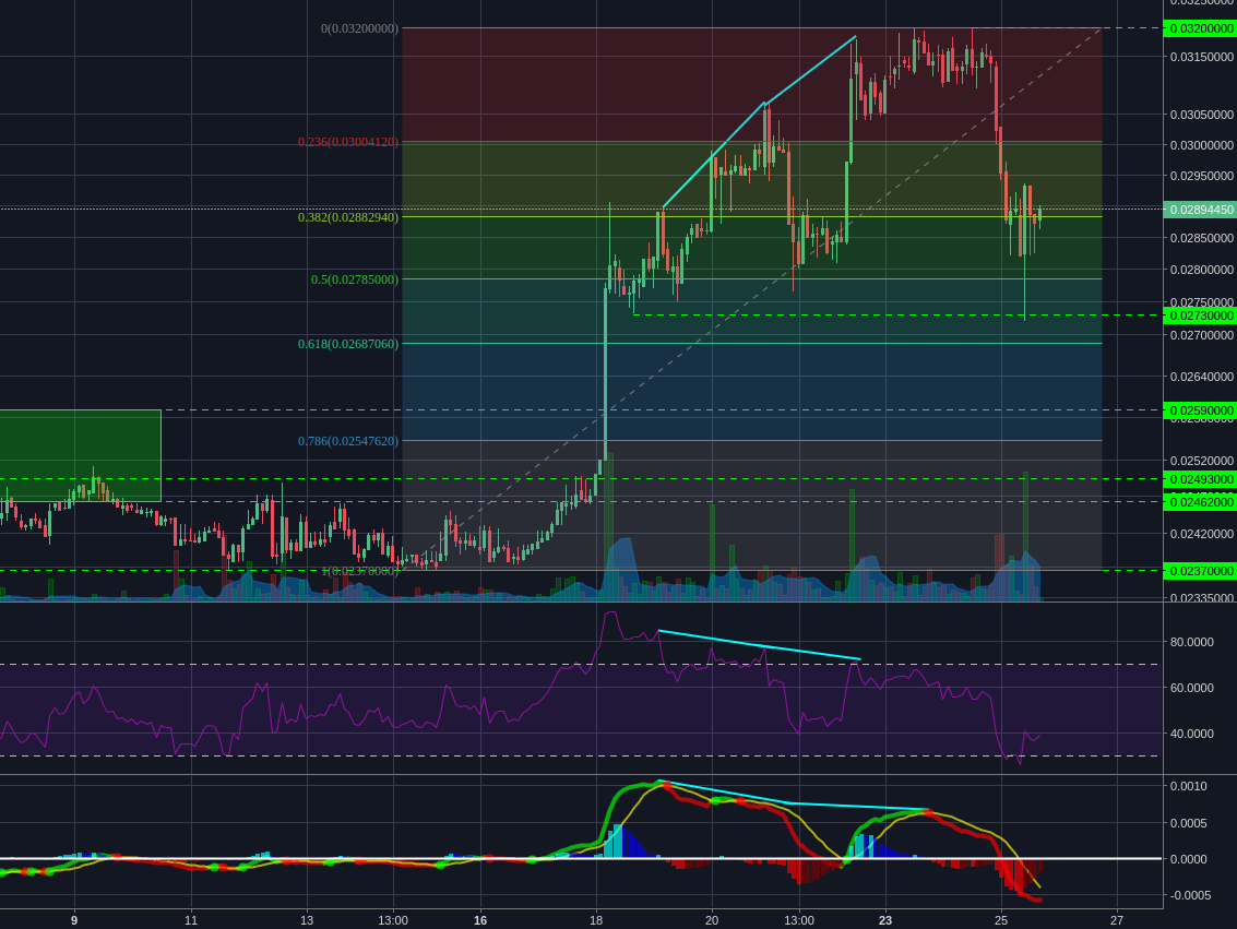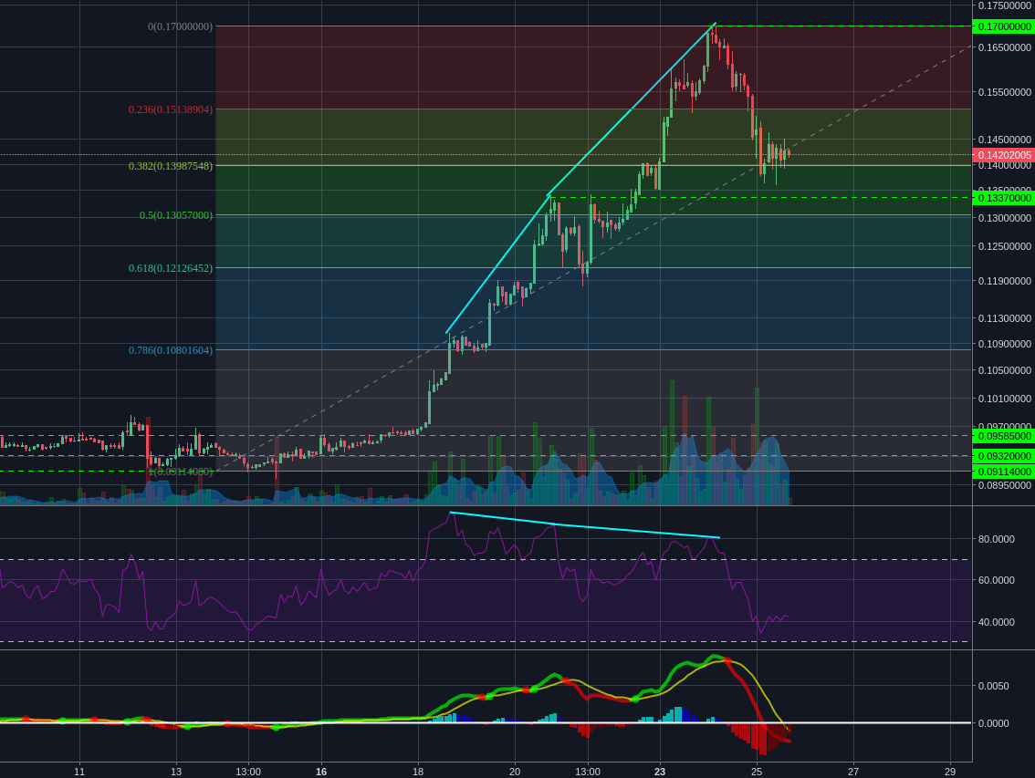 The 0.1337 support/ resistance level is the first to watch, with the 50% and 61.8% retracements below that. As with Bitcoin (and generally), its best to wait for a strong support to be confirmed with a high volume bounce and/or a bullish reversal before looking to take positions, as it'll give you a good risk limit.