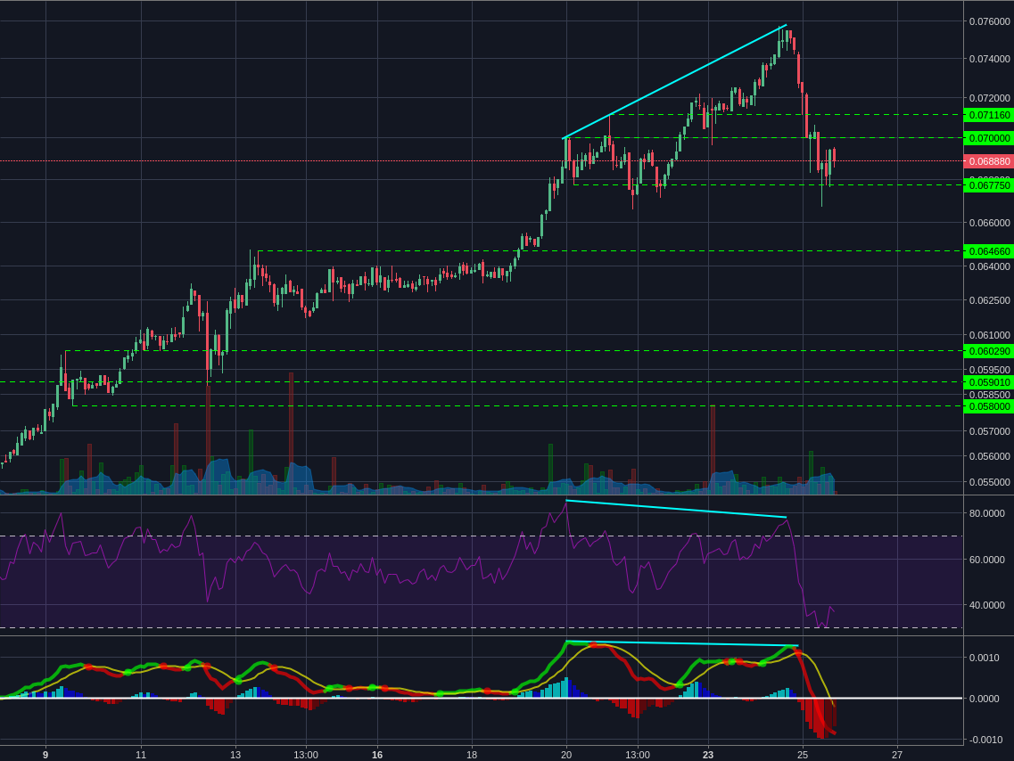 After consolidating nicely and breaking up on the 23rd, Bitcoin pushed up to $9755 on good volume and without particular signs of bearish divergence on the RSI nor the MACD. This leads me to believe this is a bullish pullback rather than a bearish reversal.
