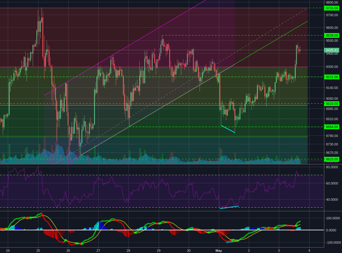 After its bullish divergence on the 1st, Bitcoin pushed back past $9222 and appears to be forming a bull flag. We're still below the $9539 resistance and the ascending support/ resistance as we approach a retest of the $9755 highs.