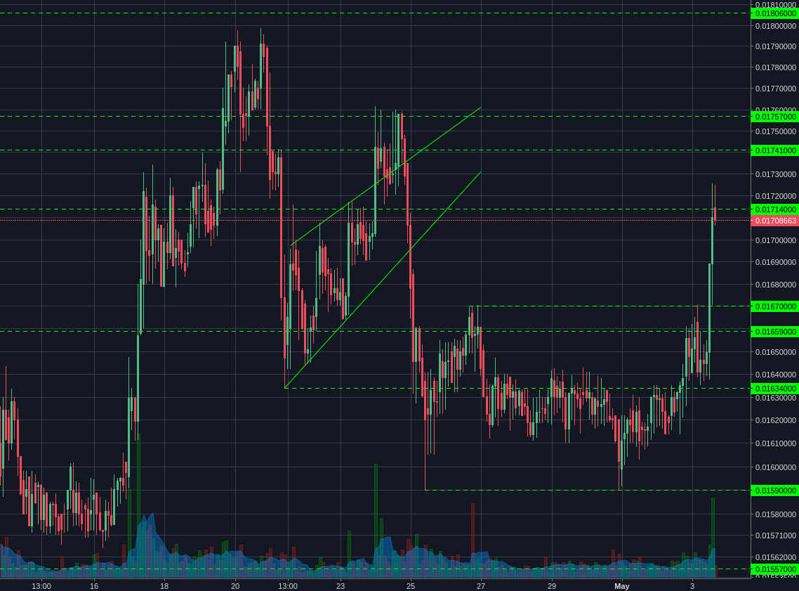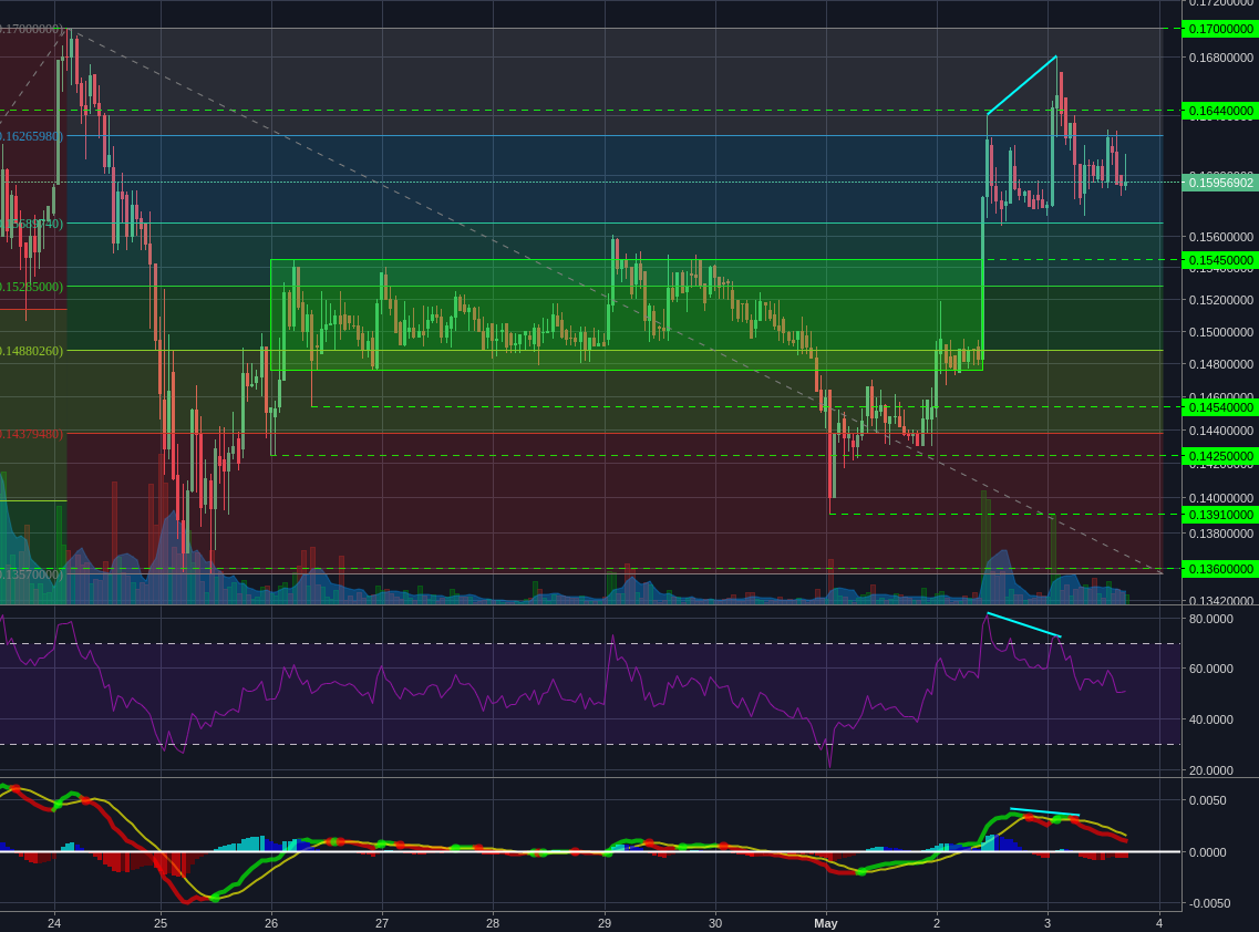 After finally pushing up from support, Litecoin made a strong pump to break 0.01670 and test the 0.01714 resistance. We haven't broken above 0.01714 yet, but the next few bars will give a lot of information about the market sentiment.