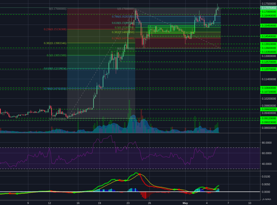 Bitcoin Cash finally broke above the 0.1700 resistance. There was strong volume on the candles leading up to the break, however momentum petered out somewhat above 0.1700. We may form a secondary consolidation zone around this level, which would be an extremely bullish sign, but keep an eye out for sudden pullbacks.