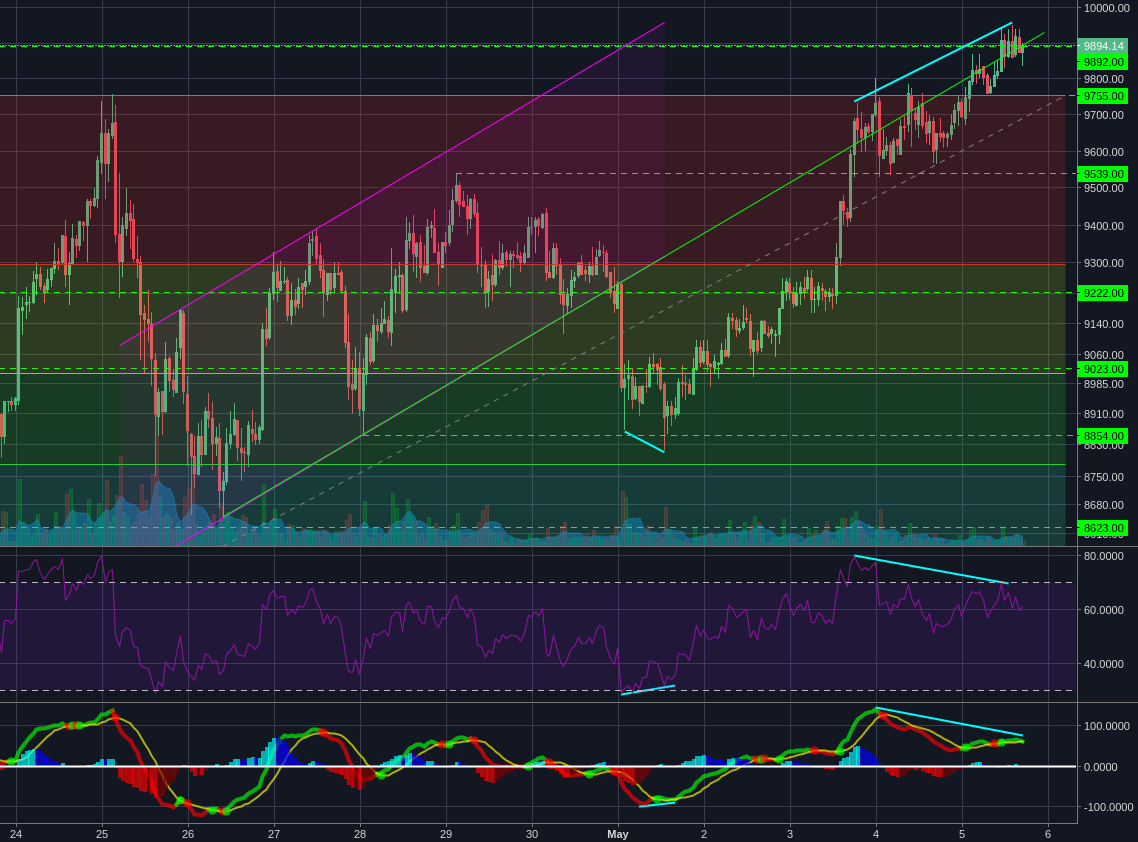 We're also seeing bearish divergence on higher time frames, between the current level and $9755. While this is yet to be confirmed with a pullback, its something to keep an eye on if volume and momentum don't pick up.