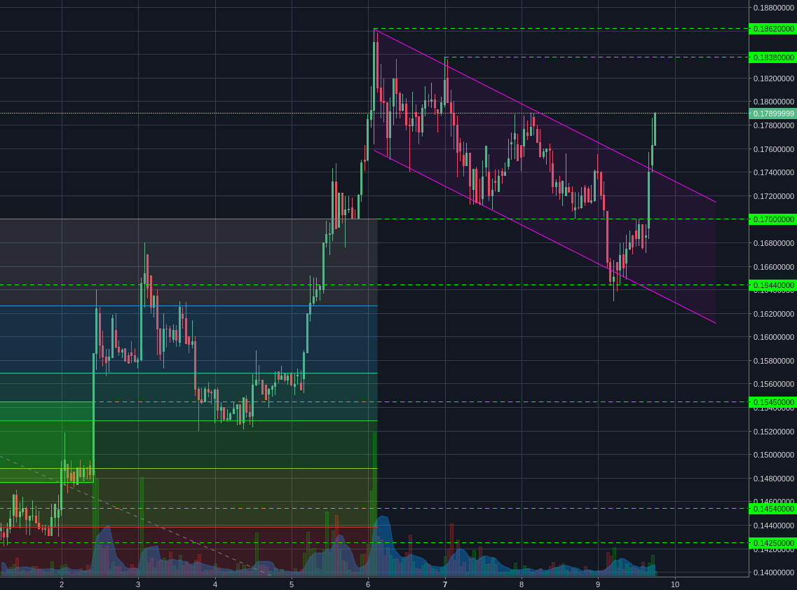 After a small test below the support of the descending channel, Bitcoin Cash made a good bounce into a break upwards. The 0.1838 and 0.1862 resistance levels will be important to watch today and tomorrow. Volume is also very low at the moment, making me a bit concerned about the strength of the break. A trailing stop-loss may be a good way to capitalise on the rise while also limiting downside risk/ loss of profit.