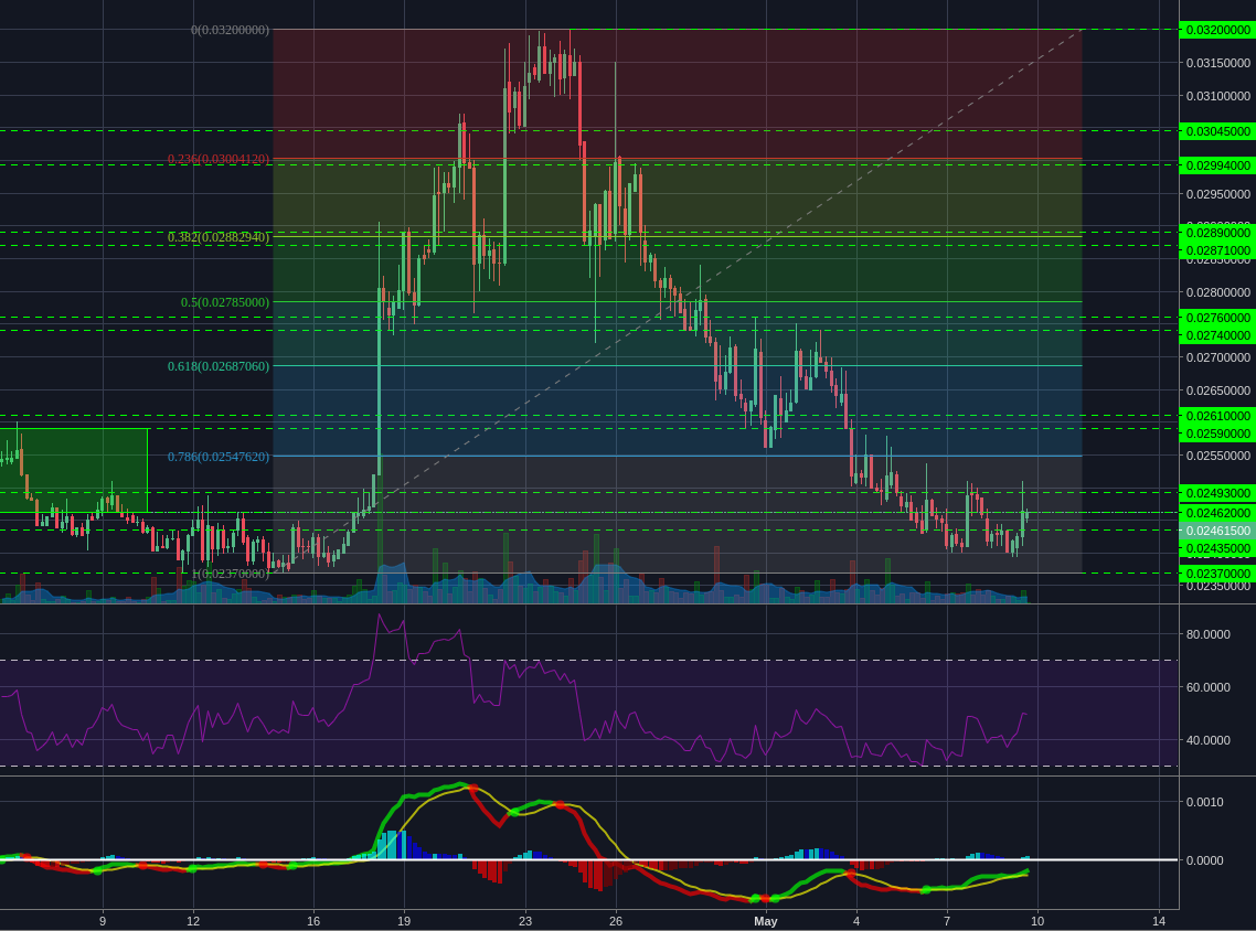 This could easily be interpreted as a bearish consolidation zone, suggesting a break below 0.02370 in the near future - which would likely lead to a longer term bearish trend.