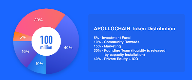 APL token yang telah dibuat berjumlah 100.000.000 token. Alokasi token adalah sebagai berikut : 40% untuk ICO, 5% untuk komunitas sebagai penghargaan, 5% bagi miners, 15% untuk humas dan marketing Apollo, dan 30% untuk tim founder.
