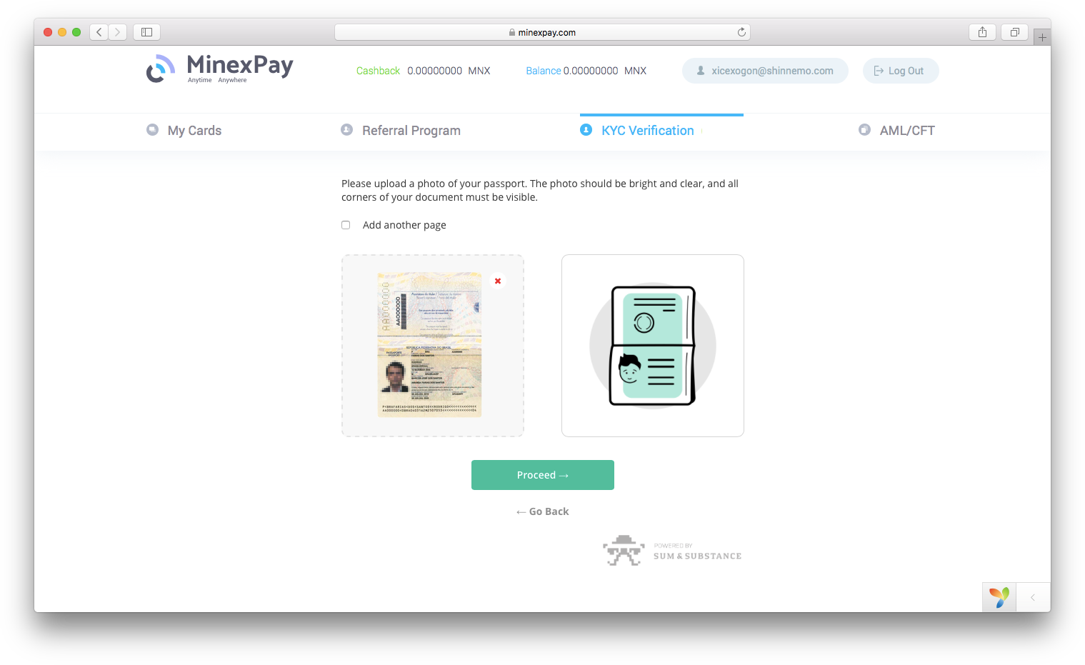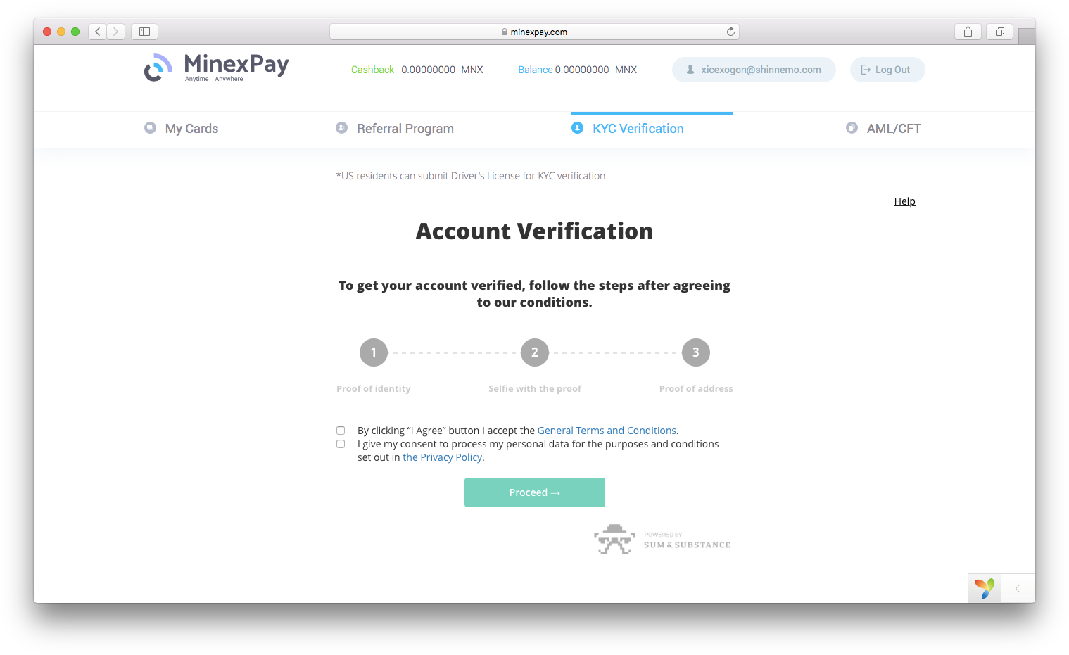 To start the KYC verification, log in to your profile and click on the respective tab in the menu. Mark all the checkboxes and click ‘Proceed’.