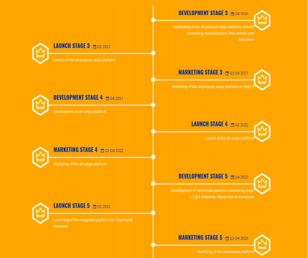 プロジェクトの本格的な範囲は、輸送業(コンテナ、バルク、ブレークバルク、液体バルク)、内陸輸送(トラック、鉄道)、航空貨物(飛行機、ドローンなどによる輸送) 、パイプライン輸送、貨物倉庫、都市間および市外共有乗車などの他のタイプの「新時代」輸送。 さまざまなタイプのトランスポート用の専用プラットフォームが相互接続され、無限の機能を実現します。 その目的は、商品と貨物のトレーダーとの間のシナジーの創出であり、すべての輸送手段はグローバル規模で行われています。 すべての参加者とユーティリティの統合は、その種のエコシステムのユニークなFIRSTを提供します。
