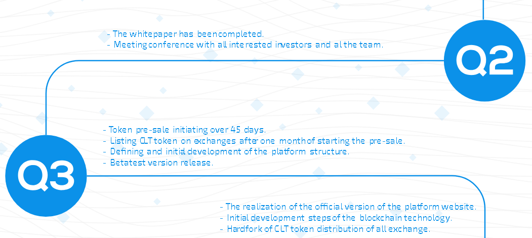 Ожидается, что объем CLT, который будет распространяться в конце года, составит 60 000 000, который предлагается продать в течение двух раундов на основе процента, хорошо изученного для каждого раунда. Исходя из этого, мы можем оценить приблизительную цену CLT на 2018 год. Основываясь на оценочном значении для нашего токена участника на Q1, прогнозируемый рынок для CLT устанавливается равным 0,7 $. Цены CLT будут продолжать расти и в разных пропорциях - от 1,1 $ в Q2 до 1,7 $ в третьем квартале. В четвертом квартале ожидается, что цена CLT возрастет до 2,8 доллара. Мы вычисляем прогнозы цены CLT, используя количество токенов, которые, как ожидается, будут распространяться в конце года, и наши оценки экспертов по значению токена и монеты в конце года.