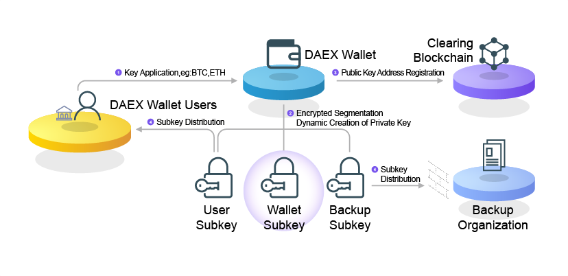 The clearing solution offered by DAEX for centralized cryptocurrency exchange is based on distributed ledger technology. Rules for both settlements and cleaning are pre-programmed in clearing clever contracts found in the clearing chain. The fully automatic cleaning process without human intervention. To better guarantee objectivity during cleaning, DAEX uses a well thought out consensus mechanism in its clearing chain. For additional transparency, digital assets stored by customers on DAEX are registered and then stored on the DAEX clearing chain. It is not possible for individuals or other institutions to access assets without permission from the asset owner.