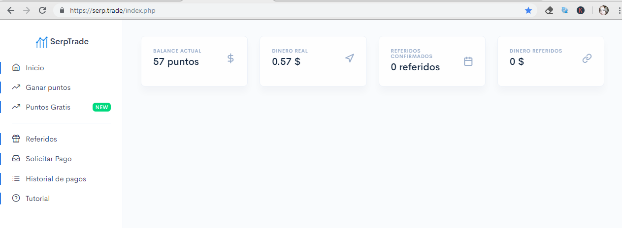 Serp Trade is a tool that manipulates the organic CTR of the search results but we will use it to earn money. They will give us a point for every search we do in Google. We will have to find the exact phrase and then click on the result that they tell us. Each point is equivalent to one cent of dollar (0.01 $). When accumulating 250 points we will charge $ 2.50 through paypal.