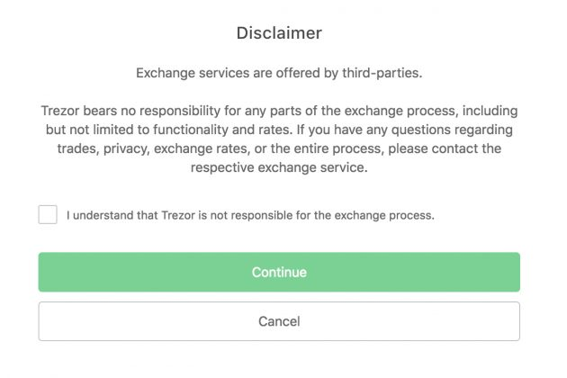 If it’s a person’s 1st time mistreatment the exchange feature, they need to conform to a disclaimer that states essentially all the trades created is between the assets’ owner and therefore the third party commercialism platform. The digital quality exchanges offered on the Trezor platform embody Changenow, Coinmama, Changelly, Paybis, and Coinswitch. The wallet’s users will swap BCH, ZEC, XRP, LTC, BTG, XMR, DASH, DOGE, BTC, ETH, ETC, and XMR.
