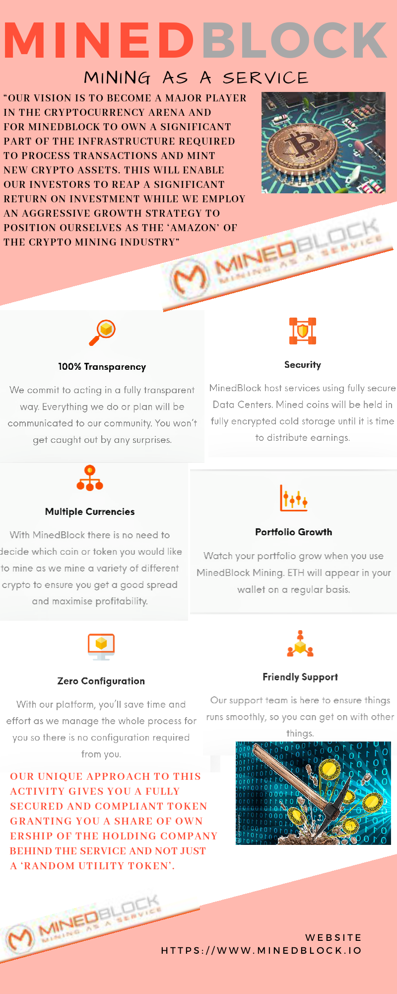 MinedBlock offers the opportunity for investors to take advantage of using the resources from a large-scale mining operation, mining multiple crypto assets without the need to buy, configure and maintain expensive mining equipment.