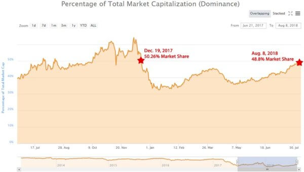 Bitcoin is almost at a 50 percent dominance level of the cryptocurrency market, according to data from Coinmarketcap. The top-ranked cryptocurrency last recorded a 50 percent market share back in mid-December 2017 and January 2018.