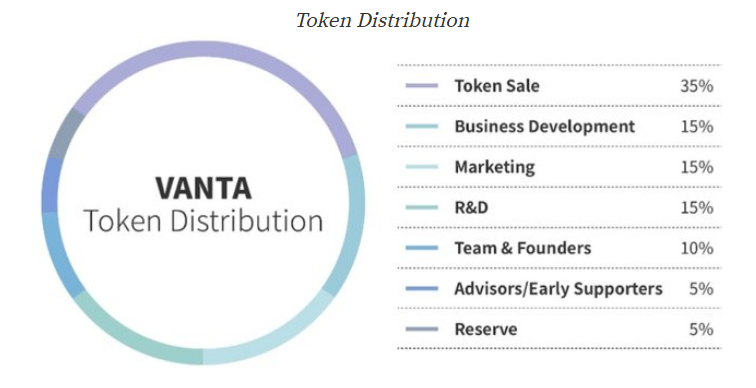 VANTA token (VNT) is a totally compatible ERC-20 token but following the mainnet launching, it'll be swapped. Overall distribution is 56.2 billion.