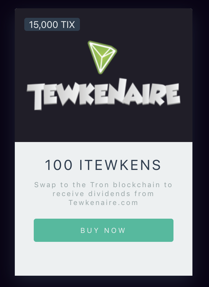 Starting this week the BlockArcade Prize Exchange has Tewkens up to exchange for $TIX! Tewkens are the internal tokens used for Tewkenaire. Tewken holders will earn dividends based on the buys, sells, and transfers from other users.