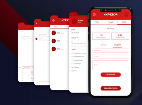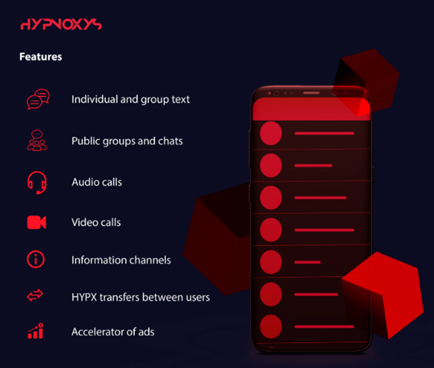 Приложение Hypnoxys предложит пользователям доступ к инициации индивидуальных и групповых текстовых чатов, общедоступных групповых чатов, совершению аудио- и видеозвонков между собой. Токен Hypnoxys также будет передаваться через приложение между тем, как они используют платформу