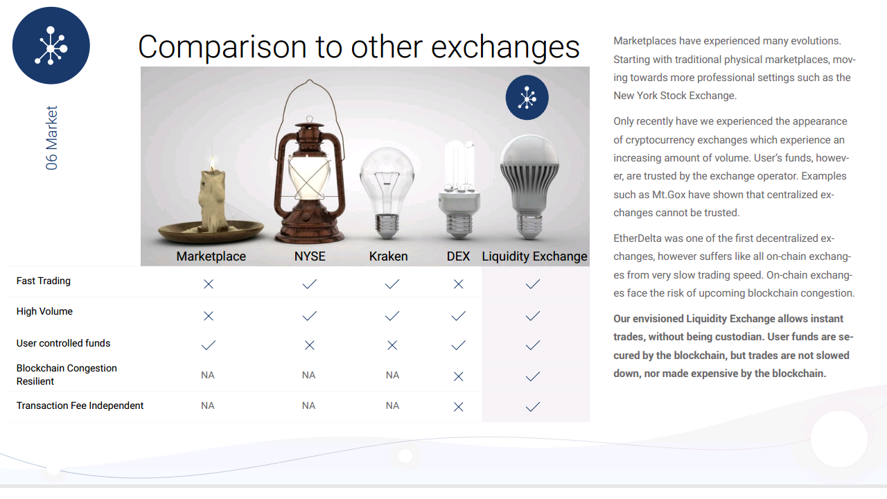 The Liquidity Exchange is designed to not hold any funds (non-custodial), while per¬forming atomic swaps off-chain. As such the exchange is resistant to blockchain congestion and excessive transaction fees. Scalable to centralized exchange throughput and beyond.
