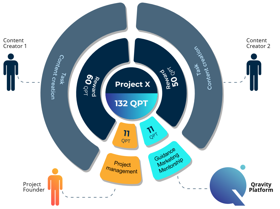 The contributions of team members are tracked using smart contracts which are published on the blockchain such that they earn Qravity Project Tokens (QPTs) allocated to that particular task by the project founders as soon as the task is reviewed and approved. As such, they cannot be traded on exchanges but are exclusively used in the platform. These tokens correspond to a share in the project ownership and are created with Ethereum smart contracts so that developers can know upfront what the rewards will be upon completing the task, thereby eliminating disputes. As they complete more tasks, they earn more QPTs. This encourages healthy competition and motivates them to give their best towards the success of the project. To keep the platform running, Qravity will receive 10% of the total QPTs allocated to a completed project.