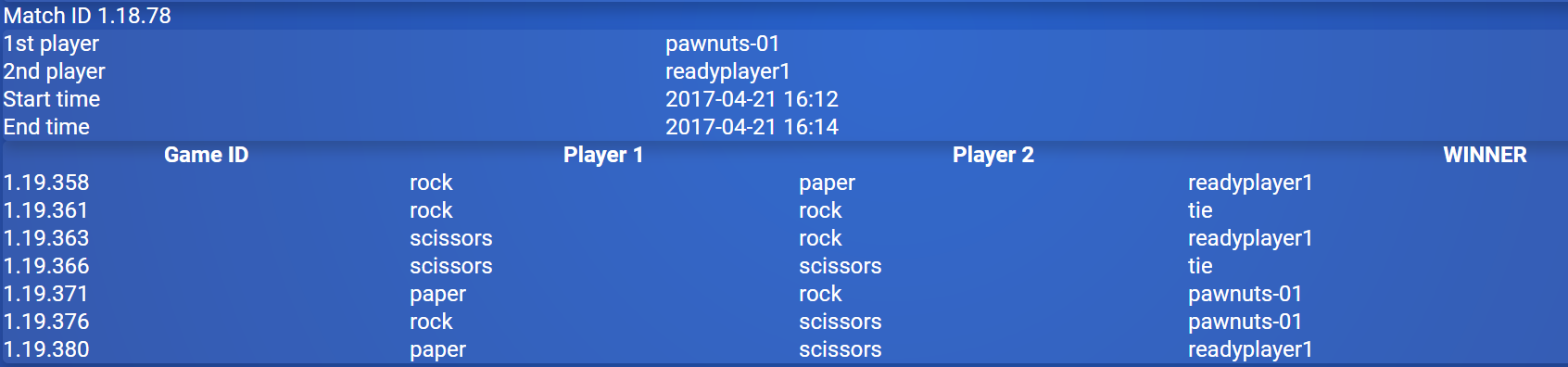 The full tournament can be found here permanently recorded on the Testnet blockchain for anyone to audit.