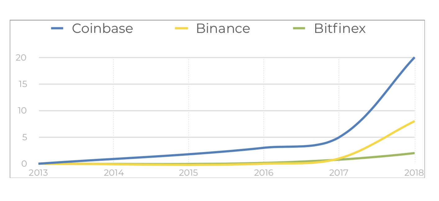 Another growth indicator is the number of users registered on exchanges. The largest exchanges today are Coinbase, Binance and Bitfinex measured by user numbers. The most dramatic growth faced Binance, the youngest exchange of the large ones in the market. Founded in June 2017 they are already managing a total of around 9 million users by today (Q2/2018). On January 10th they onboard 250.000 customers in just one hour according to their announcement one day later. Coinbase already surpassed 20 million users in Q2 2018.