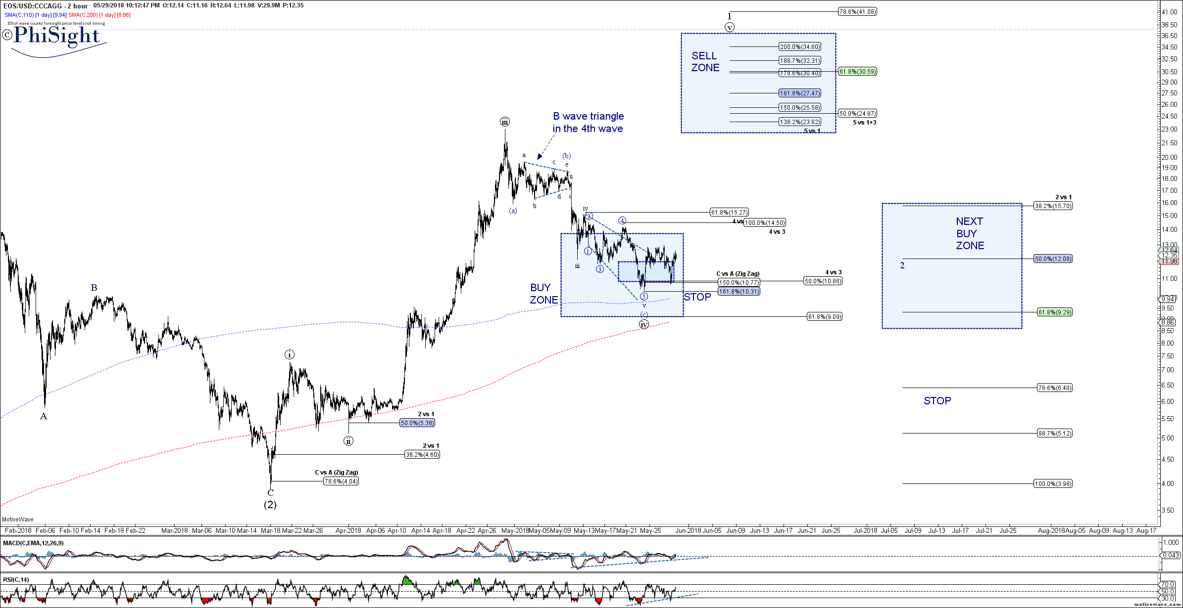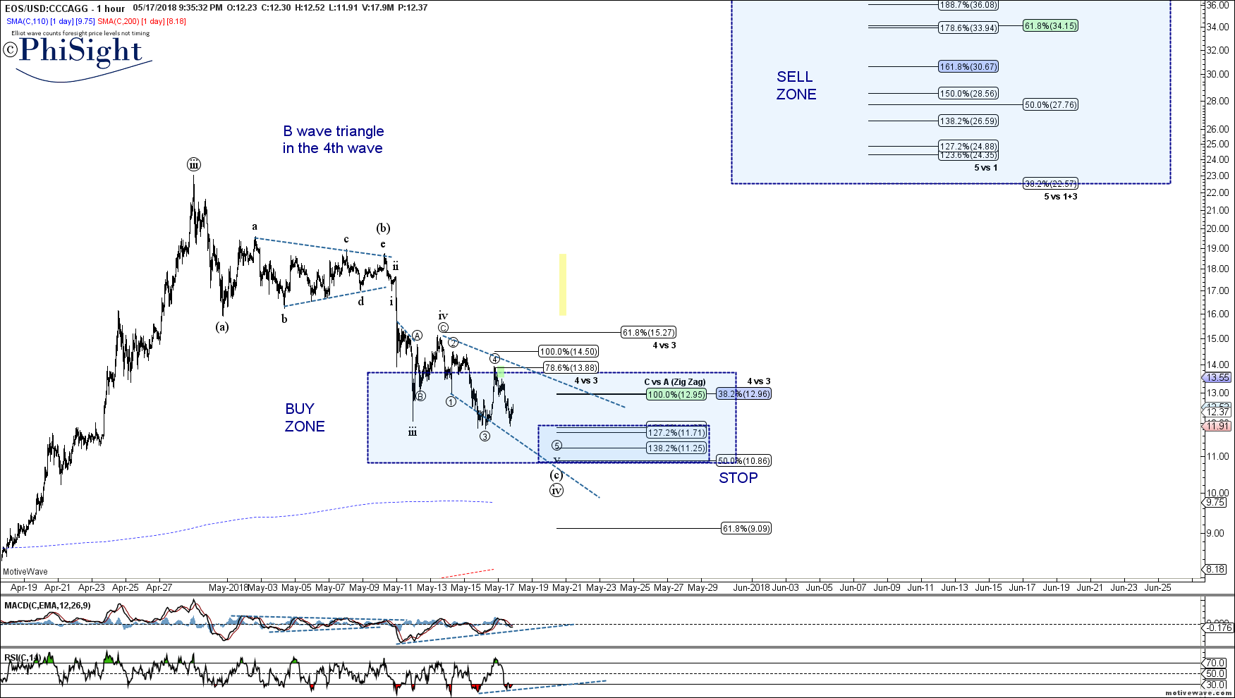 EOSUSD is following expectations and a sharp move UP is anticipated. For trading purposes, invalidation of this count/expectation is quite close by -- which is the prior low at 10.31. So, if one wants to trade this coin, then a stop at just below 10.30 means a risk of around 2 dollars for a reward of around 12-18 dollars for the next run up. With trading sizes positioned properly, this could be a good trade to consider.